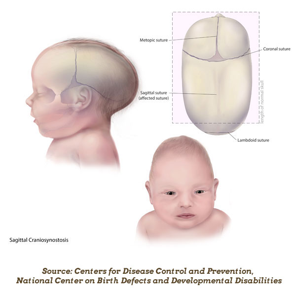 • Scaphocephaly: A long, narrow head is common with midline "sagittal" synostosis, when the suture extending from front to back over the top of the head fuses too soon. Sagittal synostosis is the most common form of craniosynostosis, accounting for about 40% to 45% of cases.