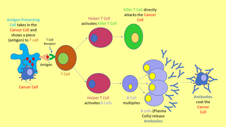 When a cancer cell is in the body, white blood cells called Antigen Presenting Cells tell other white blood cells called Helper T cells to activate Killer T cells to destroy it. Helper T cells also activate B cells (another type of white blood cell) to make proteins called antibodies. Antibodies label the surface of the cancer cells so that other white blood cells can find and destroy it.