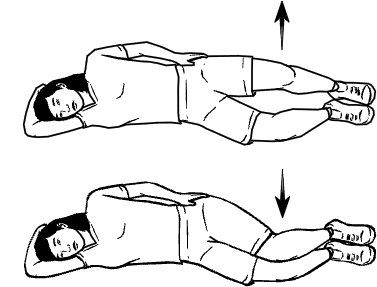- Keep your pelvis, low back, and shoulders still, and your heels together, as you slowly raise your top knee toward the ceiling. Only move as far as you are able without letting your pelvis, low back, or shoulders move, then return to the starting position.