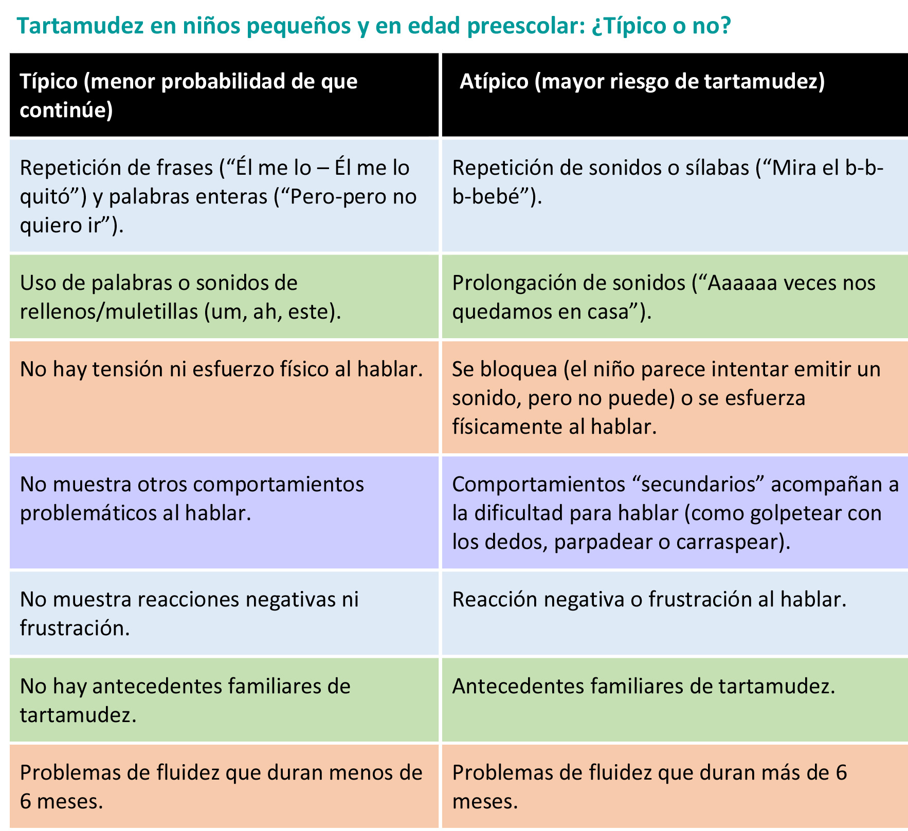 En la mayoría de los niños pequeños y en edad preescolar, la mayor parte de los problemas de fluidez desaparecen por sí solos después de un tiempo breve. En otros casos, los problemas de fluidez persisten y los signos de tartamudez se tornan más obvios. Obtener ayuda profesional en forma temprana ofrece las mejores probabilidades de reducir la tartamudez. ¿Pero cómo pueden los padres notar la diferencia entre un problema de fluidez típico que desaparecerá y los signos precoces de problemas de fluidez atípicos que pudieran indicar tartamudez?