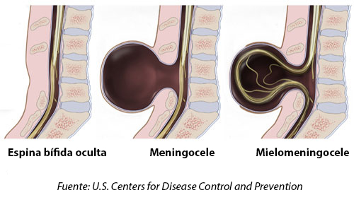 Meningocele: En este tipo de espina bífida, sobresale por la espalda del bebé una especie de bolsa llena de líquido que contiene las estructuras que rodean a la médula espinal. A veces, esta bolsa está cubierta por piel. En la mayoría de los casos, la médula espinal y los nervios son normales o solo están levemente afectados.