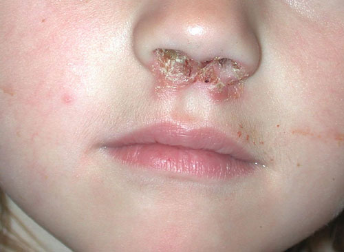 • Impétigo con costras: este es el tipo más común de impétigo y comienza como pequeñas ampollas (pequeñas burbujas llenas de líquido) que revientan y dejan manchas rojas que supuran y que al secarse se convierten en costras amarillas o de color miel.
