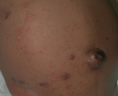 La sarna con costras se da cuando una persona tiene una cantidad muy grande de ácaros de la sarna en la piel y estos están presentes en costras grandes. Es una versión muy contagiosa, ya que tiene mucha cantidad de ácaros de la sarna para transmitir. Puede aparecer en personas con sistemas inmunitarios debilitados. Tiene un aspecto característico y es bastante rara en niños.