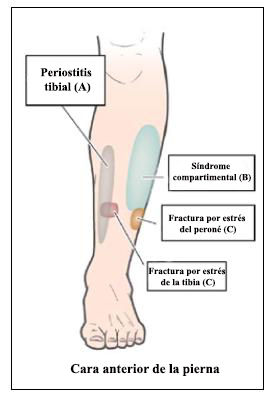 Puede diagnosticarse inflamación en los músculos según los síntomas característicos y hallazgos en un examen físico. Se sospecha de una fractura por tensión cuando el dolor del periostio se agudiza, se centra (en un área focal), o si existen factores de riesgo para debilidad ósea tales como la triada de la atleta femenina. Las radiografías pueden mostrar una fractura por tensión si el problema ha permanecido el suficiente tiempo para ver una respuesta de curación (de 4 a 6 semanas). Sin embargo, las radiografías pueden parecer normales incluso si se sabe que existe una fractura por tensión. Para confirmar la presencia de una fractura por tensión, puede ser necesaria una resonancia magnética (IRM).