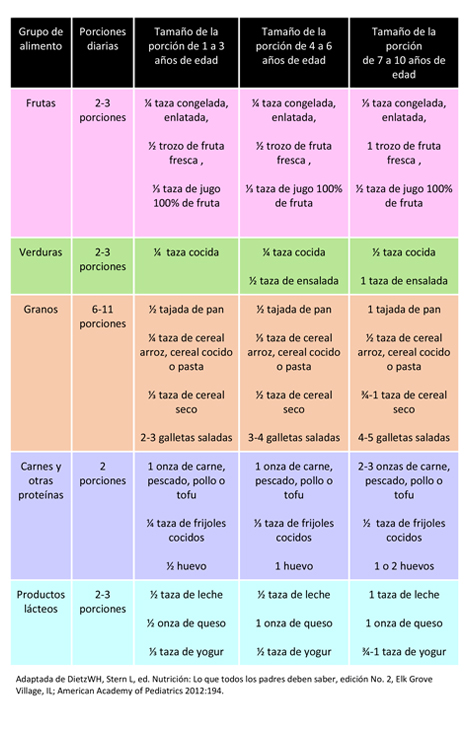 La siguiente información denota las porciones sugeridas por edad. Sin embargo, la etapa de crecimiento y desarrollo de su hijo, la edad, el apetito y el nivel de actividad contribuyen para decidir el tamaño de la porción adecuado para su hijo. En general, las porciones deben ser de "tamaño para niños" hasta la adolescencia.