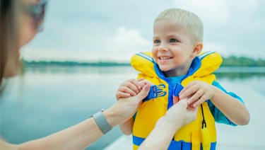Los niños siempre deben usar chalecos salvavidas cuando estén en el agua al aire libre, como lagos o ríos, o en sus cercanía. Asegúrese de que se ajusten correctamente y que estén aprobados por la Guarda Costera de EE. UU. Los niños y demás personas que carezcan de buenas aptitudes para nadar también deben usar chalecos salvavidas cuando estén en una piscina o un parque acuático.